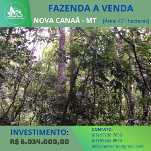 A VENDA Fazenda em nova Canaã do norte MT 431 hectares Fechada Teor de argila 44% índice pluviométrico 2100 safra e safrinha Vizinhos todos em plantio de soja e milho Distância de nova Canaã 16 km Extremamente bem localizada Essa região possui 70mil hectares abertos em plantio ao redor da fazenda. OPORTUNIDADE DE INVESTIMENTO. 14.000 POR HECTARE. ENTRE EM CONTATO PARA SABER MAIS. 61-996328970 64-933003222 @agroalvesfazendas