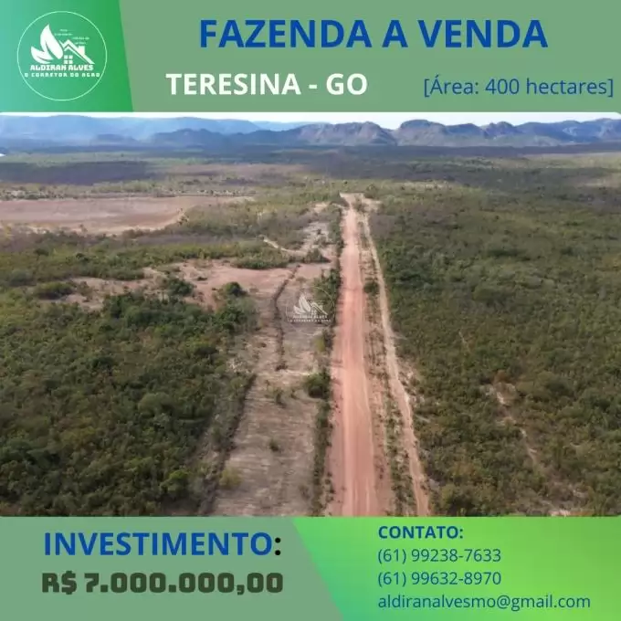 Disponível à venda uma fazenda em Teresina de Goiás 500 alqueires fica a cerca de 4 km afastado da go-118, fazenda está abandonada porém tem alguns benefícios que ainda está preservado casa um pouco de cerca energia elétrica terra de dupla aptidão pode colocar pecuária e pode plantar um pouco boa de água pois passa dois rios na mesma. Àrea dentro de região quilombola porém pode ser aroveitada Escritura de mais de 20 anos do mesmo dono VALOR DE OPORTUNIDADE. 20.000/POR ALQUEIRE PARA MAIS DETALHES Entre em contato 61-996328970 64-933003222 @agroalvesfazendas ALDIRAN ALVES AGRO